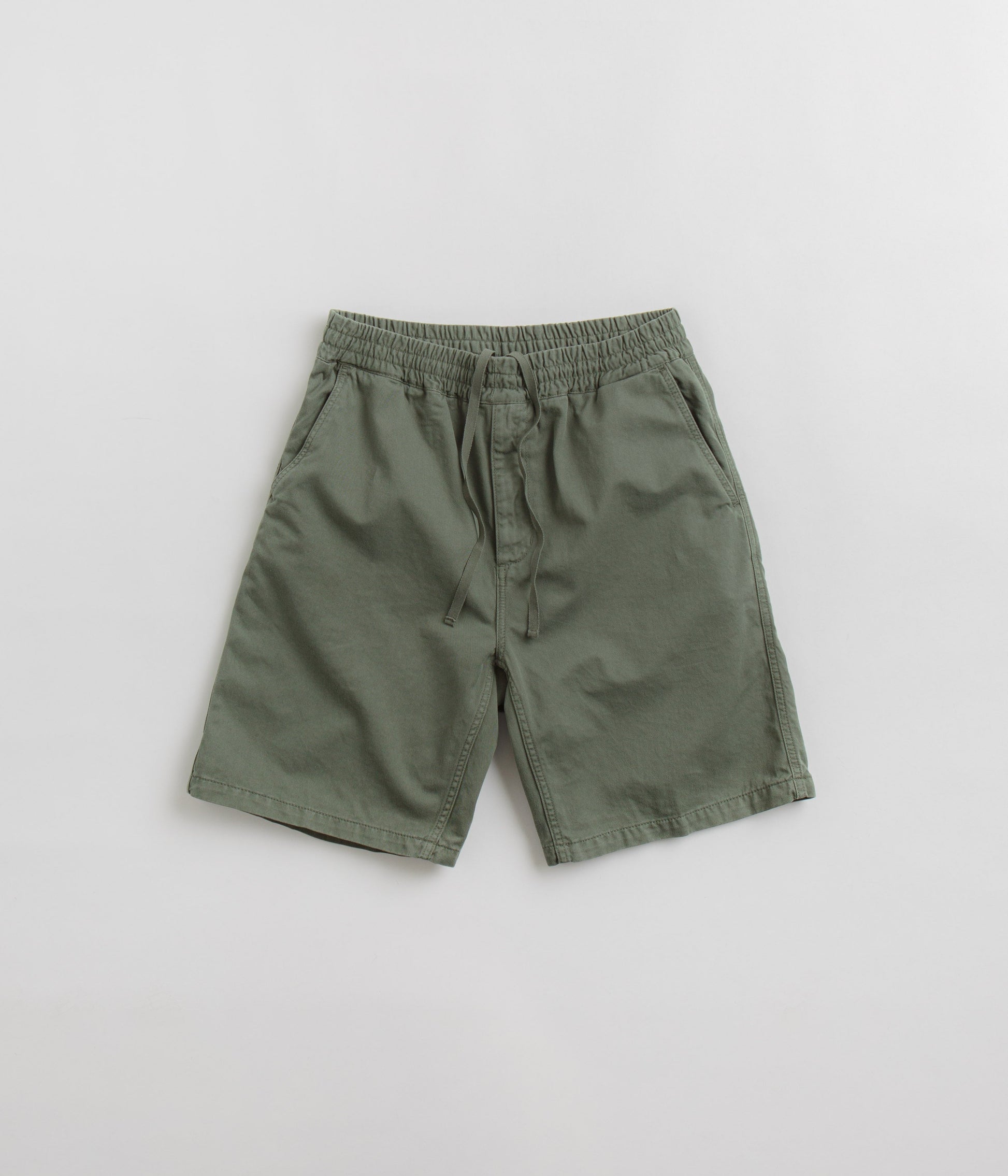 Carhartt Flint Shorts in Park. Knee length and crafted from 100% organic cotton ‘Moraga’ twill, these garment dyed Carhartt shorts are designed with an elasticated waist and a zippered fly. Finished in a shade of green with two front pockets, two rear pockets, additional tool pockets and with woven flag label branding.