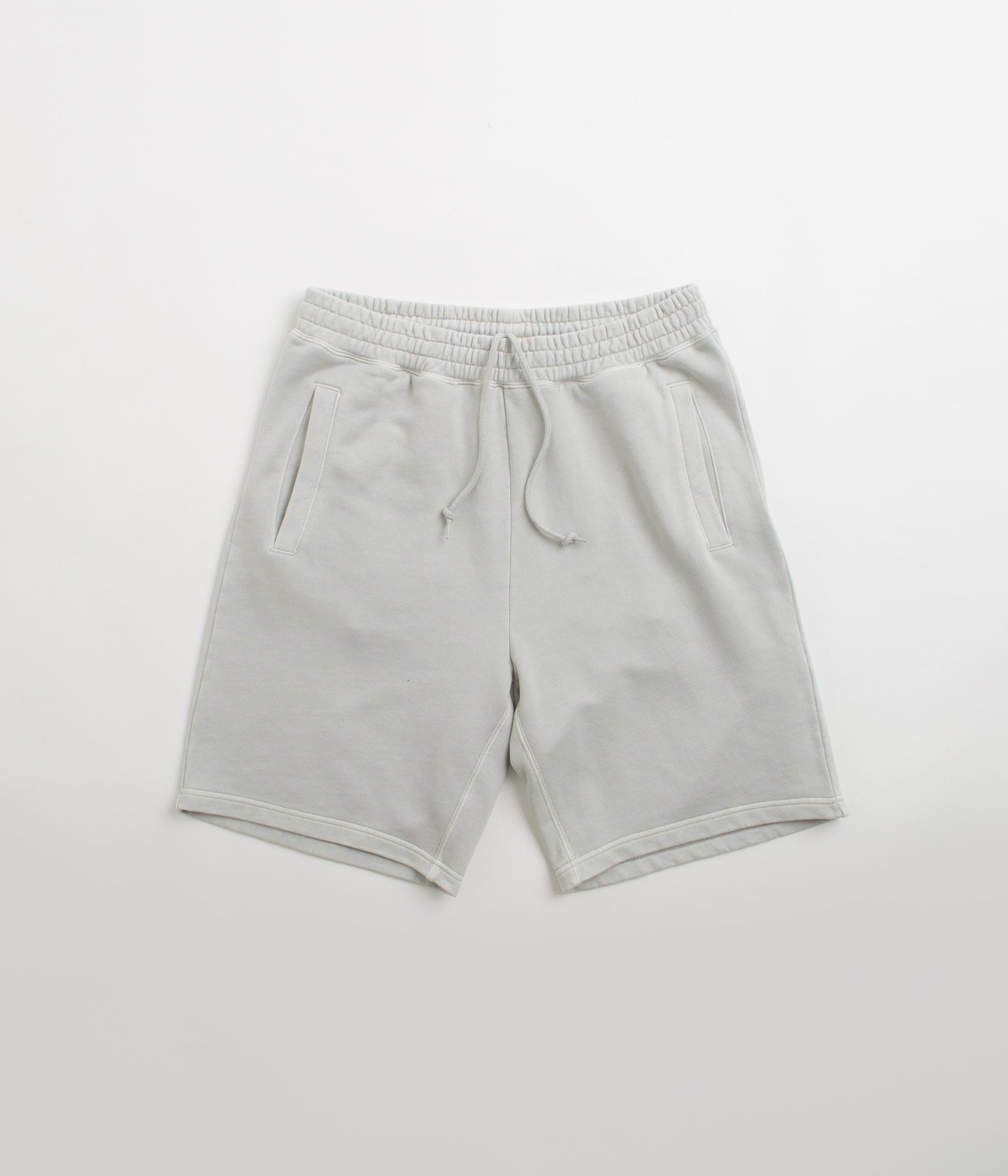Carhartt Nelson Sweat Shorts in Sonic Silver. Crafted from 100% cotton sweat, these garment dyed Carhartt shorts are tailored to a balloon-style fitting with an elasticated waist. Finished in a shade of silver grey with two side pockets, a single rear pocket and with woven flag label branding.
